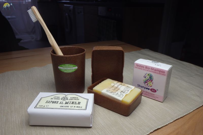Wir verwenden schon länger Seife und festes Haarshampoo, statt Duschgel in Plastikverpackung (das ist schon mal ein Anfang). Es gibt hochwertige Seifen aus Naturprodukten. Festes Haarshampoo haben wir zum ersten Mal in Frankreich gefunden.